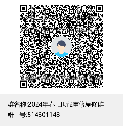 本学期申请重修复修《日语听说进阶》的同学,请加入以下QQ群和学习通网课参与学习。因课程已经开始,各项作业已经发布,请尽快加入学习通学习,以免错过作业的截止时间影响网课成绩。因个人原因没有加入学习通的同学,期末成绩出现任何问题后果自负。