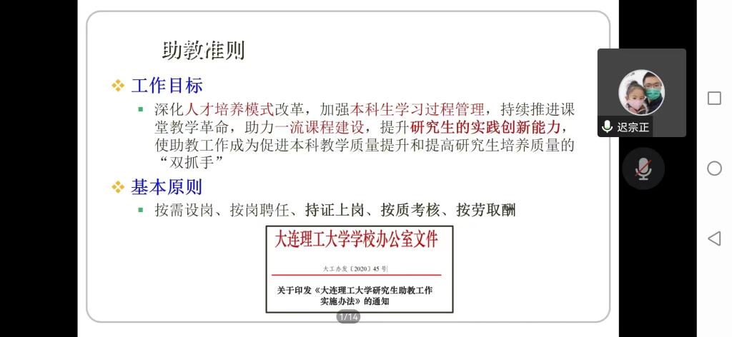 此次培训会由软件学院公共实验中心迟宗正高级工程师、外语教育中心刘辉副教授为研究生助教作专题讲座。培训主题为:角色的转变,能力的提升和如何做一名合格的助教。迟宗正老师从不同角度对助教工作提出具体要求,通过案例与制度两方面,细致讲解助教工作的重要意义及注意事项,期望研究生们真正做到帮助好学弟学妹,做一名优秀的教师助手。刘辉老师针对本次疫情对在线教学的新挑战,希望同学们能够严肃认真对待,协助好老师完成本学期的线上课程教学,打好疫情期间的教学“保卫战”。
