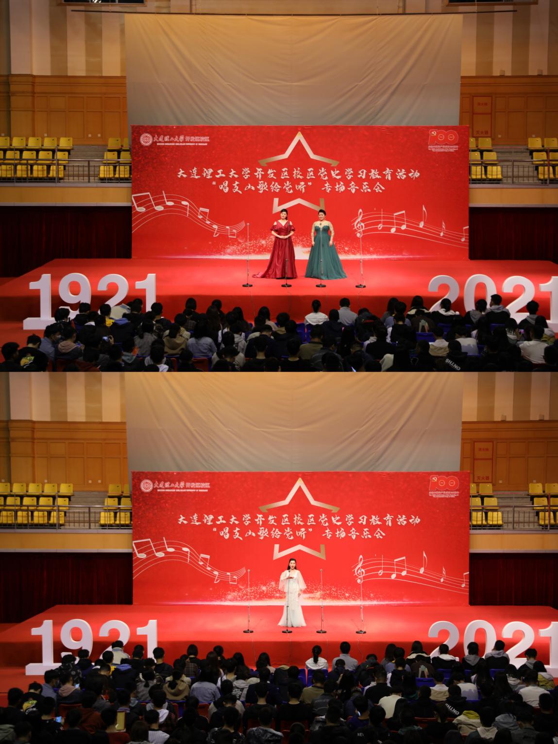 百年征程波澜壮阔,百年初心历久弥新。为庆祝中国共产党成立100周年,大连理工大学开发区校区隆重举行党史学习教育之“唱支山歌给党听”专场音乐会。开发区校区党工委副书记、管委会副主任顾丰老师,以及软件学院、国际信息与软件学院、微电子学院500余名师生出席了本次音乐会。来自大连市歌舞团的青年艺术家们献唱了16首思想深刻、脍炙人口的红色基因歌曲,打造了沉浸式的党史教育课堂,让党史学习走“新”入心。此次活动由学校团委引进并送到校区,是落实全校“我为青年做件事”的切实举措。