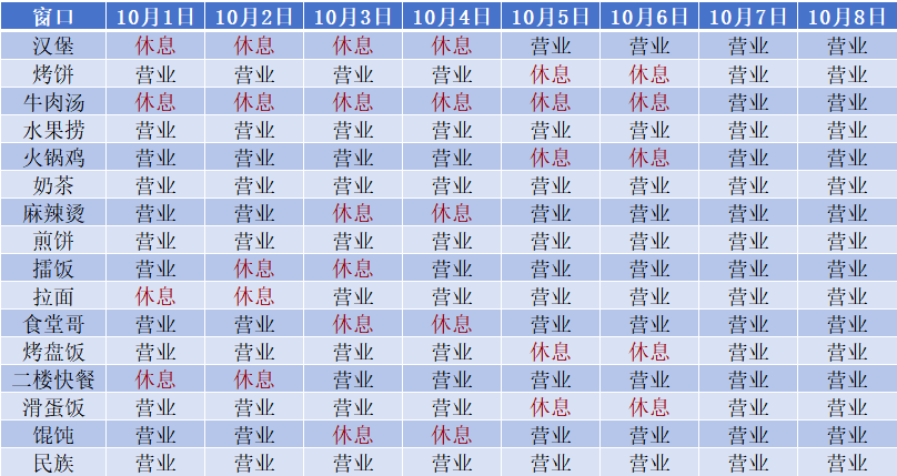假期期间食堂一至三楼正常营业,各档口实行轮休制,具体如下: