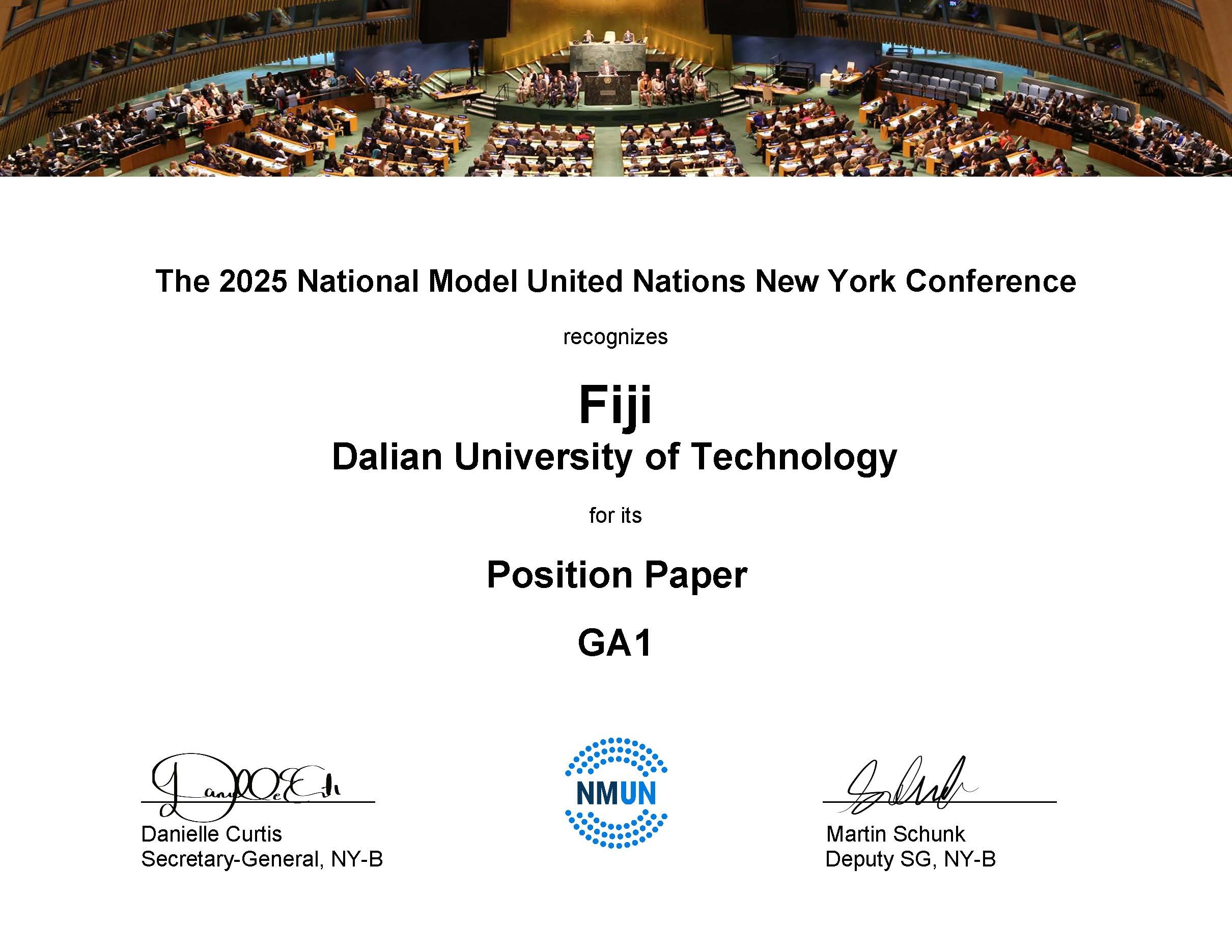 本次纽约全美模拟联合国大会于4月13日至17日在纽约举办,大会设专门评审团,根据各代表团参与委员会的表现、贡献及成果等综合评选出获奖团队。经大会组委会指定,此次我校代表团代表斐济参会,与会期间的表现得到组委会和各国代表一致好评,成为获此奖项的亚洲唯一高校。