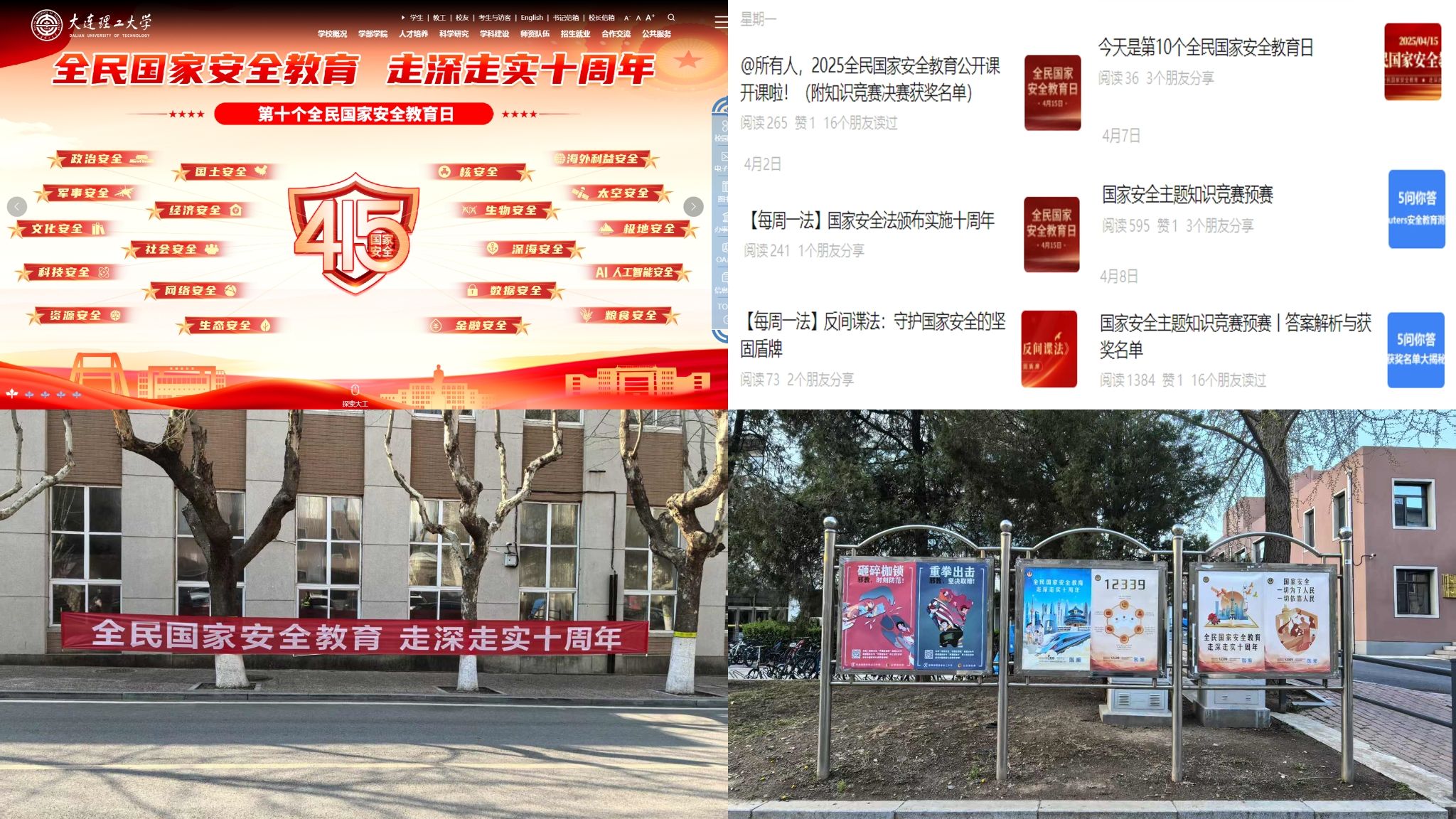 依托校园“三微一端+实体”融媒体安全宣传教育平台,积极营造维护国家安全的浓厚氛围。在学校官方网站首页上新“全民国家安全教育日”主题大图,在“平安大工”电子宣传栏滚动播放国家安全主题视频,在校园宣传栏张贴国家安全主题海报,在校园重要路段悬挂国家安全主题条幅。