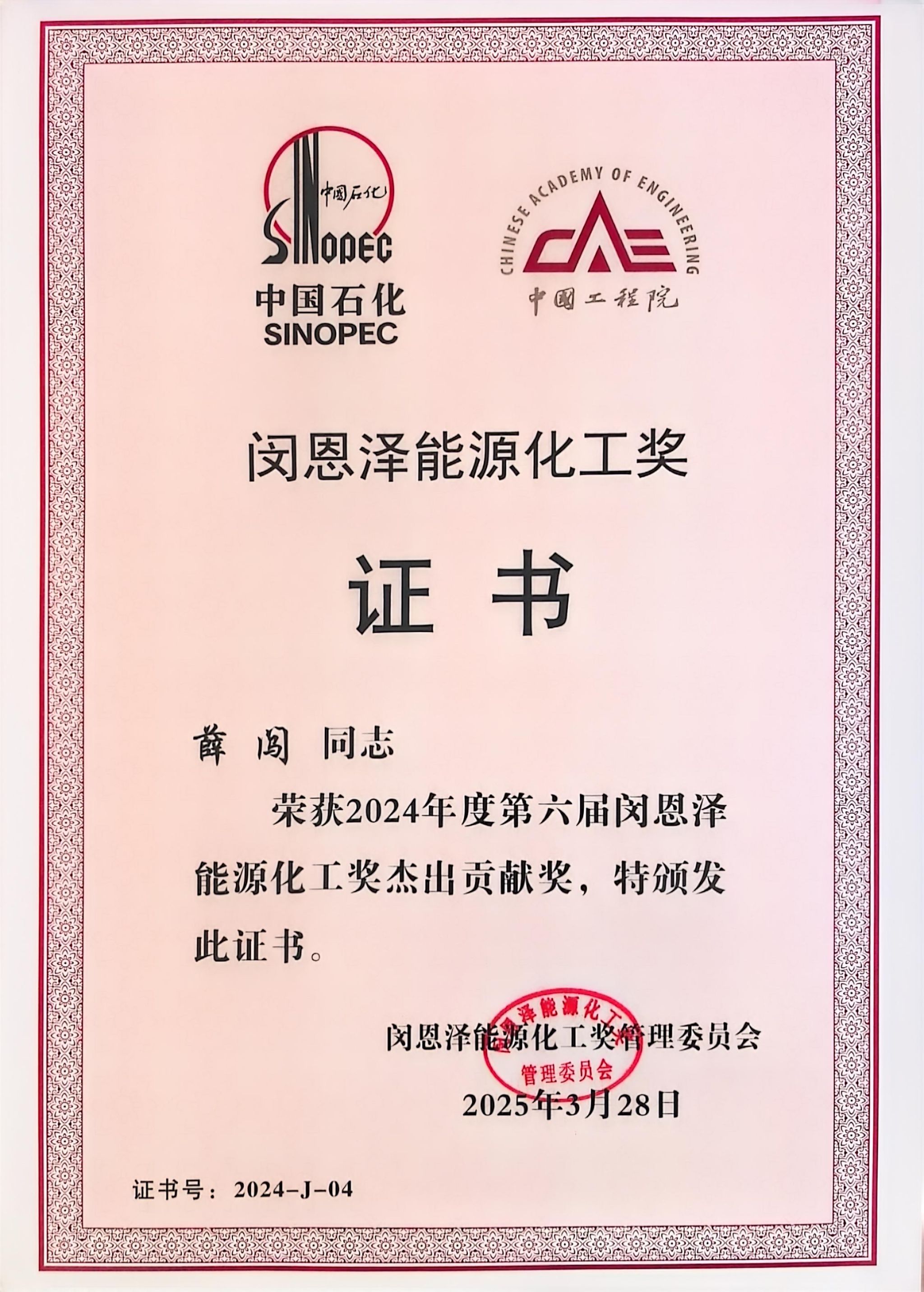 据悉,“闵恩泽能源化工奖”是由国家最高科学技术奖获得者、两院院士、绿色化学的开拓者、中国催化剂之父闵恩泽先生创立并捐资,由中国工程院和中国石化于2013年4月联合设立。奖项每两年评选一次,设有“杰出贡献奖”和“青年进步奖”两类奖项,用于奖励全国范围内在能源化工领域从事研发和产业化过程中做出杰出贡献的优秀科研人员。