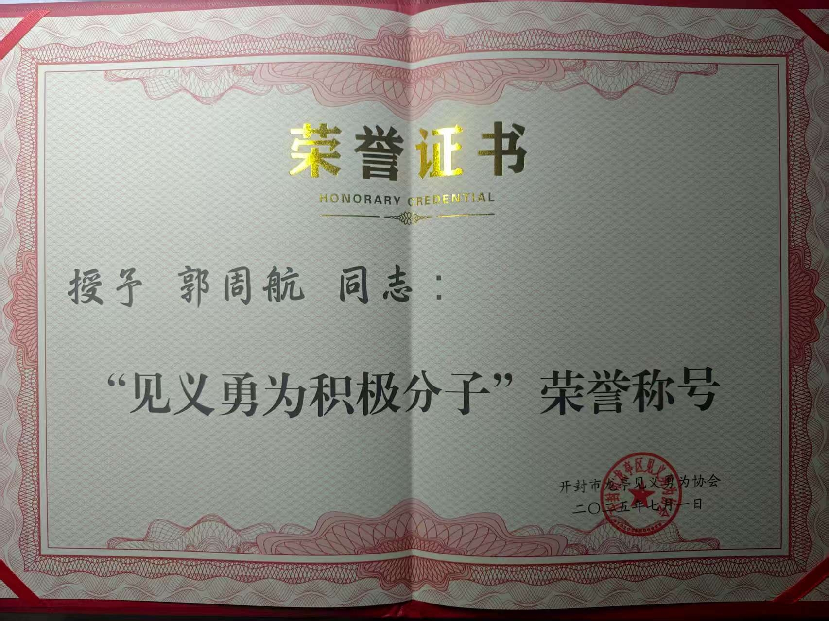 与此同时,开封市见义勇为协会也为郭周航颁发了“见义勇为积极分子”荣誉证书。据郭周航介绍,民警告诉他,在该区域的黄河救援中,成功救人的情况并不多,此次能救下父子二人,是多方协作的结果——“当时军人的同伴、周围群众都在帮忙,有的打电话联系相关部门,有的找糖果、温水,大家都在尽一份力。”